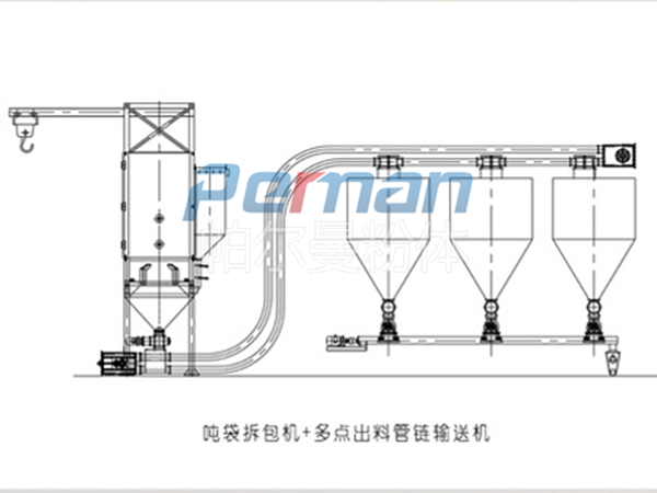 生產(chǎn)原材料會(huì)在皮帶輸送的作用進(jìn)行進(jìn)入到無塵拆包機(jī)中進(jìn)行拆包作業(yè),分離出的散料會(huì)在出料口直接進(jìn)入到管鏈輸送機(jī)設(shè)備入料口中進(jìn)行傳輸作業(yè)。