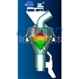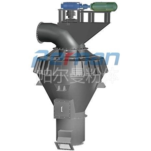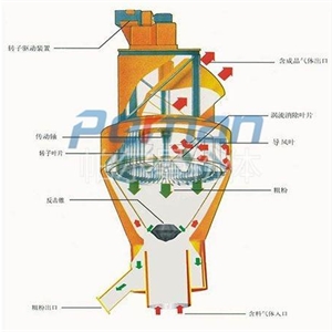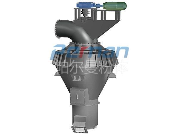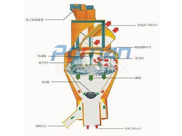 氣流分級機與旋風分離器、除塵器、引風機組成一套分級系統。物料在風機抽力作用下由分級機下端入料口隨上升氣流高速運動至分級區,在高速旋轉的分級渦輪產生的強大離心力作用下,使粗細物料分離,符合粒徑要求的細顆粒通過分級輪葉片間隙進入旋風分離器或除塵器收集,粗顆粒夾帶部分細顆粒撞壁后速度消失,沿筒壁下降至二次風口處,經二次風的強烈淘洗作用,使粗細顆粒分離,細顆粒上升至分級區二次分級,粗顆粒下降至卸料口處排出。● 適用于干法微米級產品的精細分級,可分級球狀、片狀、針狀的顆粒,也可對不同密度的顆粒進行分級。